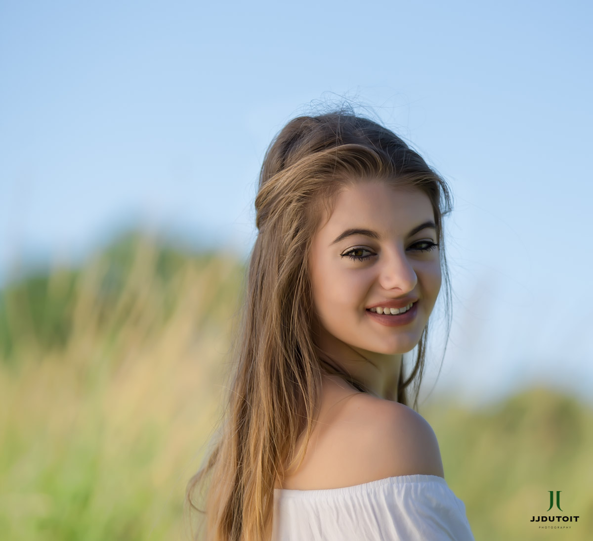 A location Model Photo Shoot done at Walter Sisulu Botanical Gardens with Cayle standing sideways and looking at the camera holding. A model wearing a white blouse and black pants.
