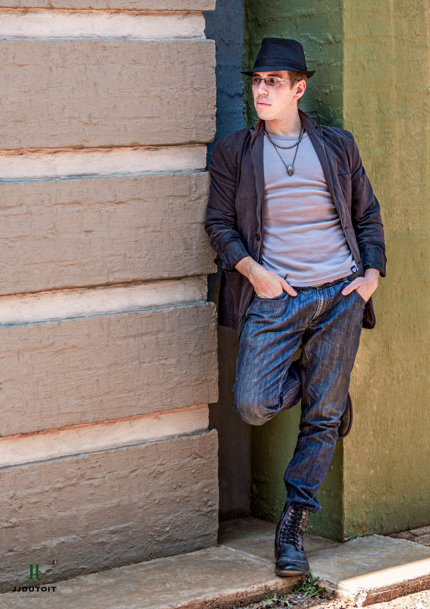 A location Male Model Photo Shoot done at Sylviavale Heritage Museum with Fabian Gabriel Spadino standing sideways against a wall, looking away from the camera and with both hands in pockets. A male model wearing blue jeans and grey T-Shirt.